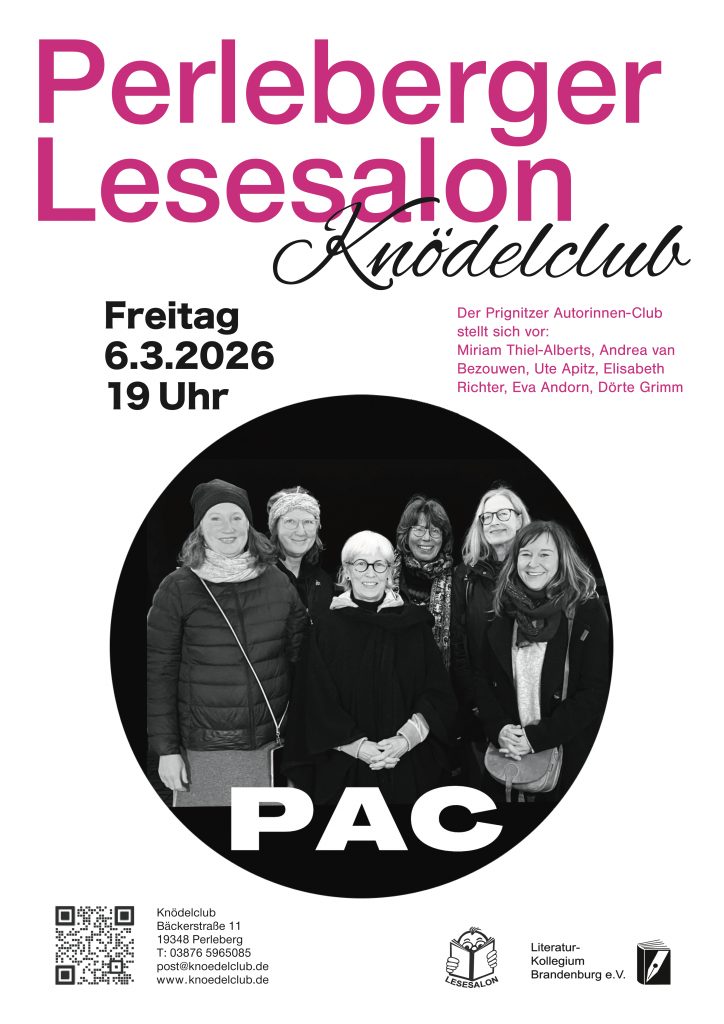 - 6. März 2026, 19:00 Lesung des Prignitzer Autorinnenclubs / PAC in Perleberg, Knödelclub – zum Frauentag: Geschichten von oder über Frauen aus der Prignitz